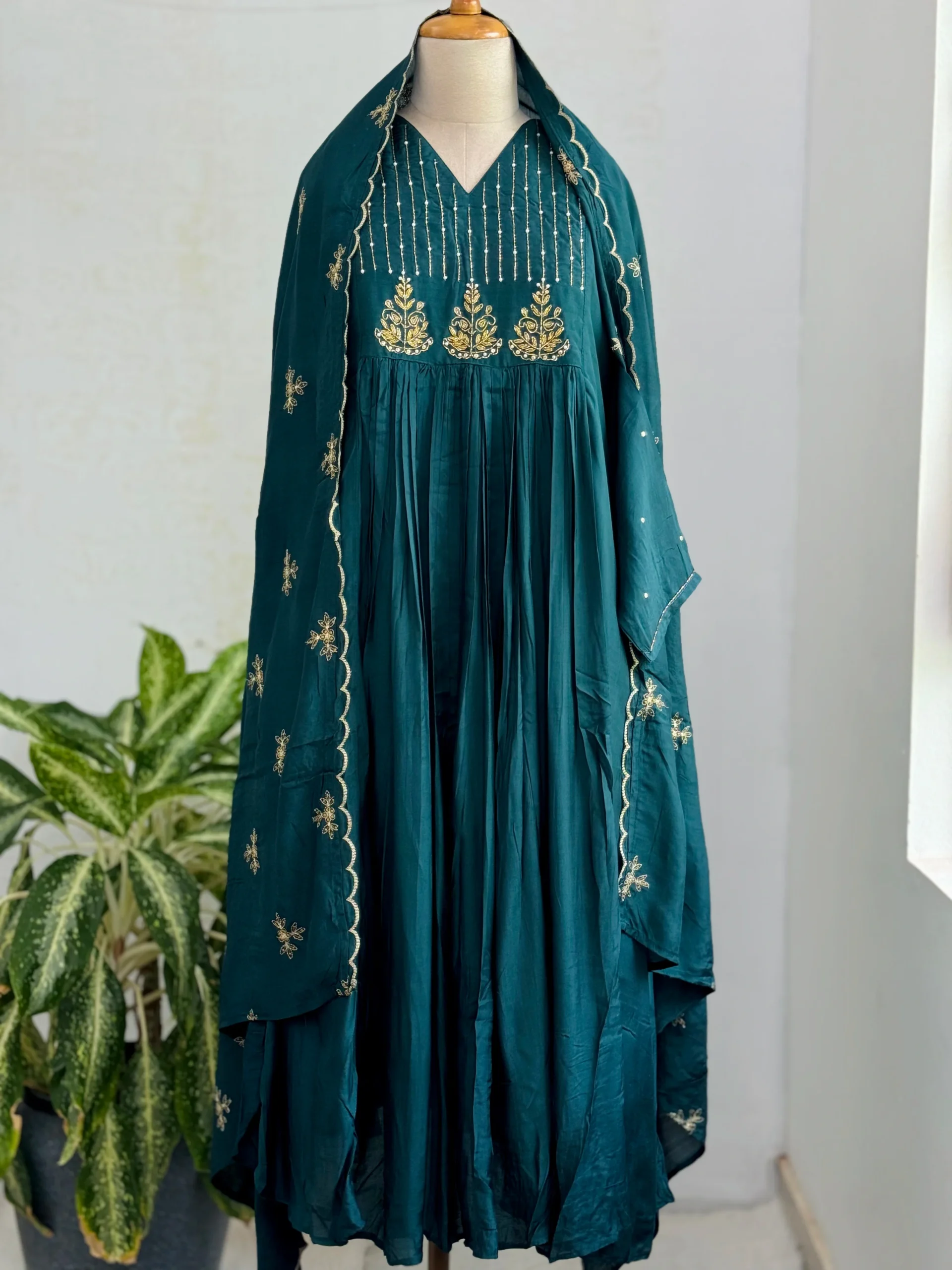 Mul Chanderi Handwork Anarkali Kurti Set โ Regal Elegance – peacock blue Color